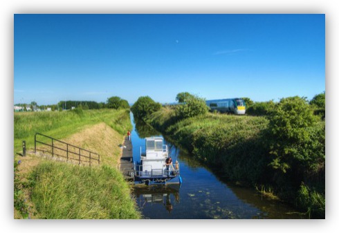 An Irish Rail Class 22000 DMU speeds past the 15th lock on the Royal Canal as fishermen make the most of a glorious summer day below. The boat moored at the jetty is a Waterways Ireland maintenance boat. The moon is visible overhead.
